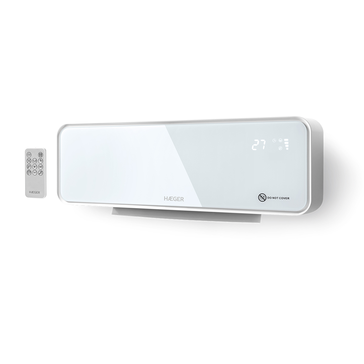 Aquecedor de parede HAEGER iShine, com design moderno e superfície em vidro, controlo remoto, ecrã digital e termostato regulável. Rápido aquecimento graças as 2 configurações de aquecimento (1000W